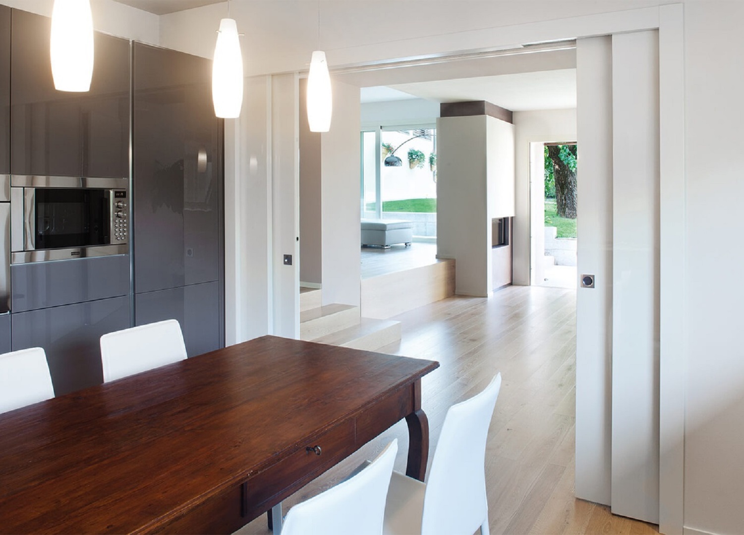 Drzwi przesuwane chowane w ścianie nie tylko umożliwiają swobodę aranżacyjną wnętrz, ale także łatwe przystosowanie pomieszczeń do aktualnych potrzeb domowników. Przy ich pomocy można w szybki sposób rozdzielić kuchnię od jadalni, czy sypialnię od garderoby.